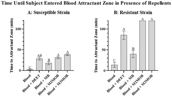 Figure 6. Repellent activity in presence of food source. The amount of time (mean +/− SEM) it took for subjects in susceptible strain (A) and resistant strain (B) to enter the blood attractant zone, in minutes, when zone is surrounded by a repellent compound [0.14 μL/cm2 of DEET, methyl benzoate (MB), methyl 2-methoxybenzoate (M2MOB), or methyl 3-methoxybenzoate (M3MOB)]. Error bars are not shown for M2MOB and M3MOB of the resistant strain because all subjects went the entire 120 min without entering the attractant zone for both treatments. Different letters above them are significantly different at α = 0.05. A: ANOVA: n = 20 per treatment (n = 100 total), F(4, 95) = 27.07, p < 0.0001. Holm-Šidák’s multiple comparisons: Control vs. any other treatment, p < 0.0001; MB vs. M2MOB, p = 0.0294; MB vs. M3MOB, p = 0.0083; all other comparisons not significant. B: ANOVA: n = 20 per treatment (n = 100 total), F(4, 95) = 11.77, p < 0.0001. Holm-Šidák’s multiple comparisons: Control vs. DEET, p < 0.0001; Control vs. MB, p = 0.0011; Control vs. M2MOB, p < 0.0001; Control vs. M3MOB, p < 0.0001; DEET vs. MB, p = 0.0442; MB vs. M2MOB, p = 0.0001; MB vs. M3MOB, p = 0.0001; all other comparisons were not significant.