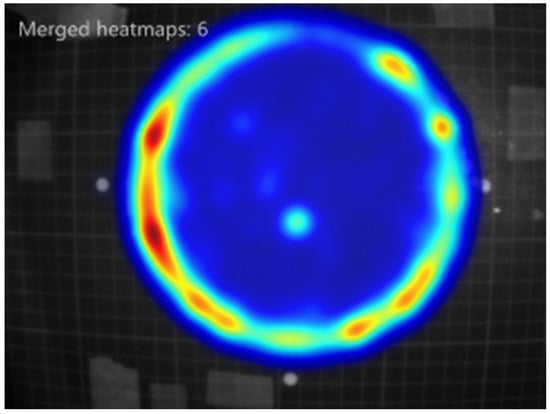 Figure 7. A representative heatmap showing where bed bugs within the four-disc repellency assay spent time, with cool (blue) colors indicating less time, and warm (red) colors indicating more time. The repellent treated filter paper disc was at the top position, while the three untreated filter paper discs were at the right, left, and bottom positions. This image was merged from six of the eight trials where methyl benzoate was tested after 24 h (the other two trials were performed on a second setup, and therefore not included in this file).