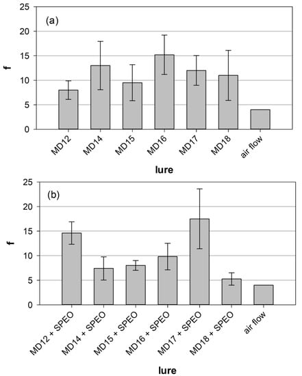 For each lure, the experiment was repeated several times (Tables S1 and S2 in the Supplementary Materials). The effectiveness factor f of the lure was calculated using Equation (1):