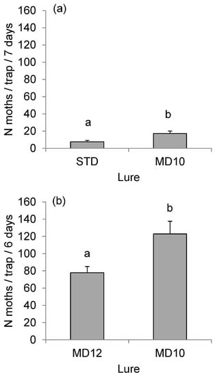 Experiment 2 was carried out from 31 July to 6 August and included the MD10 and MD12 lures (Table 1) to evaluate the effect of SPEO on the effectiveness of the complete lure. Each lure was tested in 10 replicates.