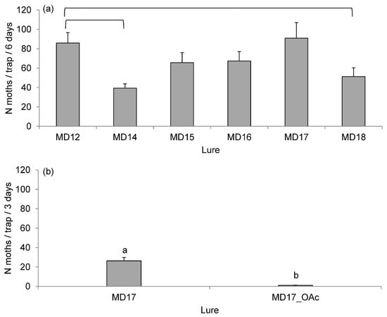 Experiment 4 was set up on 27 July 2016 and lasted until 30 July 2016. It aimed to evaluate the effect of adding (Z5)-10:OAc to the MD17 lure found most effective in experiment 3. Thus, we tested the MD17 and MD17OAc lures, each lure in 10 replicates.