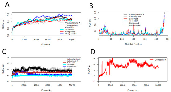 RMSD and RMSF results from the molecular dynamics simulation studies are shown in Figure 2A–D, and the individual results are in Figures S4–S8. The stability of protein, indicated by the RMSD changes with respect to Frame No, is presented in Figure 2A. Similarly, the average RMSDs of the protein and standard deviations are shown in Table 7. The binding of validamycin A, 67837201, 10406567, and Compound 1 to AgTre resulted in smaller RMSD changes in the protein compared to the binding of validoxylamine A (the previously reported trehalase inhibitor with the best affinity for trehalase). On the contrary, the binding of Compound 2 resulted in more conformational changes to the protein structure. However, all conformation changes were less than 3 Å, suggesting that the conformation of the protein was stable throughout the MD simulation [59]. RMSF describes the flexibility of each amino acid residue in the protein during the MD simulation. The larger the RMSF value is, the more flexible the residue is. Regarding Figure 2B, the amino acid residues with RMSF > 1.5 Å represent the flexible residues in the loop region of the protein. Similar flexible patterns in the protein were observed upon binding of the different ligands. The RMSDs of the ligands (validamycin A, 67837201, 10406567, Compound 2, and validoxylamine A) are shown in Figure 2C, while that of Compound 1 is shown in Figure 2D. Similarly, the average RMSDs of the ligands and standard deviations are shown in Table 7. The average RMSDs of validoxylamine A, validamycin A, 67837201, and 10406567 reveal that these compounds do not significantly change their orientation during the simulation; hence, they form stable complexes with the protein. This is also confirmed in the histogram (Figure S7). However, Compound 1 was unstable with large changes in its RMSD, having an average RMSD of 5.46 Å with a standard deviation of 1.40 Å (Table 7). Compound 2 showed slight changes early in the simulation but returned to conformations similar to the docking conformation. It had an average RMSD of 1.17 Å and a standard deviation of 0.23 Å. The compound (10406567) exhibited the best stability during the MD simulation with an average RMSD of 0.96 Å and a standard deviation of 0.07 Å. This was followed by Compound 2 and 67837201; 67837201 had an average RMSD of 1.46 Å with a standard deviation of 0.10 Å. The average RMSDs for these compounds was lower than those of validamycin A and validoxylamine A, suggesting that the three compounds maintained relatively stable conformations throughout the simulation period.