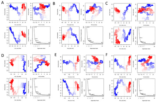 PCA plots of the protein backbone in the complex, comprising graphs of PC2 vs PC1, PC2 vs PC3, PC3 vs PC1, and an eigenvalue rank plot with the cumulative variance annotated for each data point. (A) Validoxylamine A; (B) validamycin A; (C) 67837201; (D) 10406567; (E) Compound 2; (F) Compound 1.