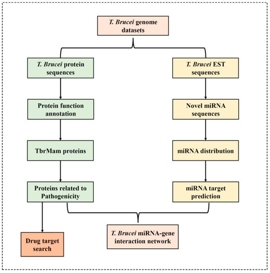 The most intensively studied trypanosome subspecies is Trypanosoma brucei brucei (abbreviated as T. brucei in this manuscript). A total of 5576 EST sequences of T. brucei were retrieved (20 June 2022) from NCBI database (https://www.ncbi.nlm.nih.gov/nucleotide/). The genome annotation (Assembly ID:ASM244v1) of involved species was downloaded (20 June 2022) from UniProt database (https://www.uniprot.org) [15]. All known miRNAs were collected from miRBase [16]. The workflow of this study was shown in Figure 1.