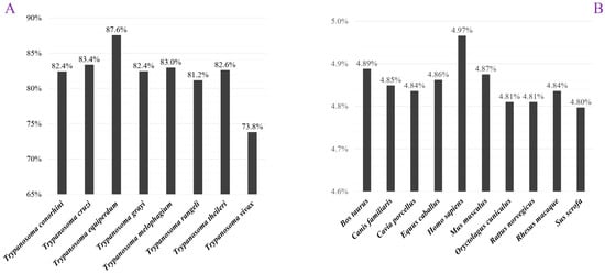 Homolog distribution of T. brucei proteins. (A) The homolog percentage of T. brucei when compared with other trypanosomes; (B) the homolog percentage of T. brucei when compared with other mammals.