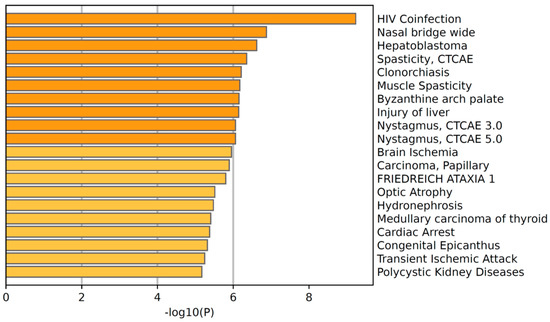 We further investigated the disease category associated with the TbrMam proteins by Metascape tool to identify which disease was related to African trypanosomiasis. We listed the top 20 enriched diseases in Figure 3, where the term “HIV coinfection” was the most significant associated disease (p-value = 6.3 × 10−10). Interestingly, trypanosome infection is always accompanied by HIV coinfection and the phenomenon is regarded as a clinical event of great relevance [35,36]. Scientists have reported that the presence of an intracellular pathogen (such as trypanosome) could impair HIV-1 transduction in the cellular experiment in vitro [37]. On the other hand, HIV aspartyl peptidase inhibitors could also act on pathogenic trypanosome [38]. We believe that other enriched diseases could also be associated with trypanosome infection, which warrants a future investigation.