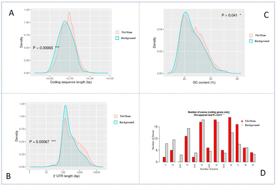 Genomic specificity of identified TbrMam genes when compared with the whole genome. (A) Comparison of coding sequencing length; (B) comparison of 3′-UTR length; (C) comparison of GC content; (D) comparison of exon numbers, the red bars indicate the TbrMam protein, while the gray bars indicate the background proteins. The asterisk symbol indicated the significance of statistical genomic specificity in the figures.