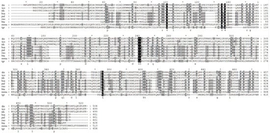 Multiple sequence alignment of Pi3K proteins among different species. The asterisk indicated the middle of two sites. The shadow indicated the similarity level in the site. Abbreviation for the species: bta, Bos taurus; hsa, Homo sapiens; mmu, Mus musculus; pal, Pteropus alecto; rno, Rattus norvegicus; tbr, Trypanosoma brucei; tco, Trypanosoma conorhini; tgr, Trypanosoma grayi; tth, Trypanosoma theileri.