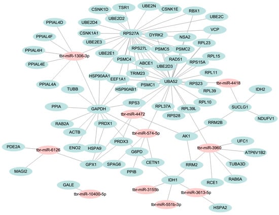 To explore the regulatory mechanisms of miRNA in T. brucei, we constructed the miRNA-gene network using Cytoscape. The resulting network was composed of 15 miRNAs and 551 edges (Figure S2). Most genes were found to co-regulate by over two miRNAs and these genes were supposed to work systematically through co-regulated miRNAs in special biological processes. We then applied toolkit “NetworkAnalyzer” inside Cytoscape to calculate the betweenness centrality of each edge in the network (Table S1). We further selected the top edges to construct a sub-network (Figure 6). In the resulting sub-network, several key nodes were found: RPS27A, UBA52 and GAPDH. The RPS27A was reported to regulate proliferation, promote cell progression and inhibit apoptosis of leukemia cells. This gene might act as a controller of microglia activation in triggering neurodegeneration in trypanosome infection [45]. The UBA52 regulates ubiquitination of ribosome and sustains embryonic development, and is essential for the replication of virus–host interaction in chicken [46]. GAPDH is a multifunctional protein present both in eukaryotes and prokaryotes. This molecule has been reported to be correlated with redox status in trypanosome [47]. These results suggest that the identified nodes are critical molecules involved in the infection of T. brucei.
