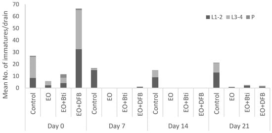Immature mosquito population (1st–2nd and 3rd–4th instar larvae and pupae) of Ae. albopictus pre-treatment (Day 0) and post-treatment (Days 7, 14, and 21) with oregano essential oil (EO), oregano essential oil + diflubenzuron (EO+DFB), and oregano essential oil + B.t.i. (EO+B.t.i.) in road drains in Crevalcore, Italy, during July 2019.