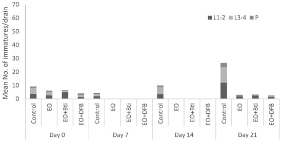 During the field trials, the immature mosquito population in the experimental drains was dominated by larvae of all stages (L1–L4), whereas a small number of pupae were detected (Figure 1 and Figure 2); hence, the population composition was appropriate for the evaluation of larvicide treatments effects for the EO of oregano and its mixtures with diflubenzuron and B.t.i. targeting the larval mosquito stage. All experimental drains contained water throughout the field study, with a mean water depth of 17.6 cm (±0.6) and a mean water temperature inside the drains of 26.5 (±0.3) °C. Collected mosquito species belonged to Cx. pipiens and Ae. albopictus, as reported by Evergetis et al. [40] in mosquito samplings from catch basins treated with the same EO in the same area one year earlier in 2018. According to Figure 1 and Figure 2, Cx. pipiens was more abundant compared to Ae. albopictus. It must be noted, however, that both species were present in the untreated control of road drains at each sampling time point throughout the pre- and post- treatment trial using the larvicidal agents.