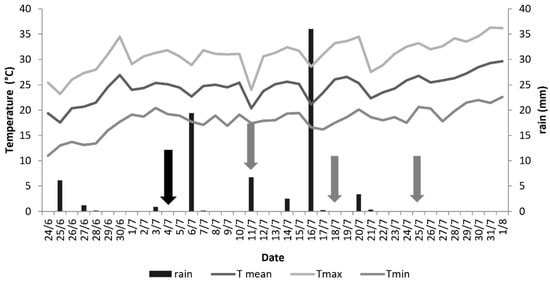 Meteorological data (min, max, and mean Temperature (°C) and rainfall (mm)) during the field study (4–25 July 2019) in Crevalcore, Italy. Data were obtained from the closest weather station, located 1.7 Km from the study area (Sant’ Agata Bolognese weather station). The black arrow indicates Day 0 (treatment day); grey arrows indicate Days 7, 14, and 21 post-treatment.
