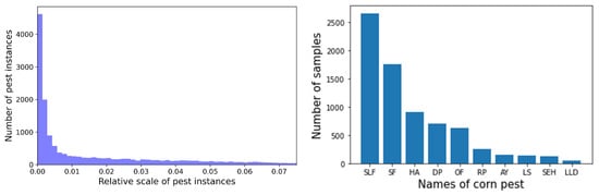 As shown in the left of Figure 2, we can observe that the relative size of the corn pest tends to be small, which will bring a great challenge to accurate detection. Additionally, the distribution of the number of pest instances is imbalanced which hinders the recognition of corn pests with few samples, as shown in the right of Figure 2.