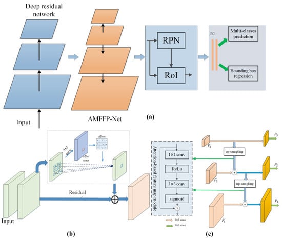 In this section, we report implementation details of our proposed detector, as shown in Figure 3. First, we introduced the deep residual network with deformable convolution. We revisit the network architecture of the feature pyramid network (FPN) and analyze its working principle. Then, attention-based multi-scale feature fusion pyramid networks (AMFFP-Net) were developed based on FPN. Finally, we merged the proposed modules with the Faster R-CNN detector, achieving the recognition and localization of multi-classes corn pests.
