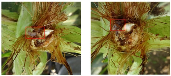 Additionally, we further explored the detection accuracy of each category of corn pest. In Table 2, we can see that the precision of class “DP” only has 44.0% AP and 46.3% recall, which is lower than other classes of corn pest. We found that serious occlusion will significantly decrease the recognition accuracy, as shown in Figure 4. In the next work, we will focus on this challenge.