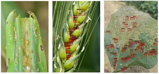 To verify the effectiveness of our proposed method, we also visualized some detection results on the corn pest dataset, as shown in Figure 5. It demonstrates that the proposed method can achieve the accurate recognition and localization of corn pests. However, we also found that there exist some poor results; for example, some corn pests are undetected, as shown in Figure 6. On the left of this figure, the pest is not detected using our method because the pest instance is concealed in the background. This will hinder the precise detection of corn pests. Additionally, we also observed that the dense distribution of small corn pests also causes poor performance in the proposed detector, as shown in the middle and right figures of Figure 6. These problems need to be addressed in future work.
