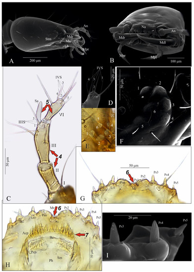 Functional positions of nasale (Na), antennae (At), mandibles (Md), maxillae (Mx), maxillary palps (Mp), labium (lb), labial palps (Lp) and ligula (Lg) as in Figure 3A,B. Antenna relatively short (Figure 3C,D): length ratios of articles I–IV = 1:2.7:4.1:2.4. Article I 1.7× as wide as long; article II almost 1.9× as long as wide, with two pores; article III 3× as long as wide, with three macro setae, one moderately elongate, finger-shaped and slightly curved sensory appendage (Sa), 4.6× as long as wide, three solenidia (IIIS1–3) of different lengths and two pores; article IV short and club-shaped, widening strongly to apex, 2.5× as long as wide, solenidia apically (IVS1–4); length ratio of article IV and Sa: 1.2:1. Stemmata present, ordered as shown in Figure 3E,F. Anterior margin of nasale with 8 obtuse teeth and 10 peg setae (Figure 3G–I)—four pairs of teeth (2[Pmt, Lt1-3]): a pair of wide paramedian teeth (Pmt), three pairs of narrow lateral ones (Lt1-3), Lt1 and Lt2 similar in size, Lt3 smaller than the others and median tooth absent; five pairs of peg setae (2[Ps1-5]): setae of Ps1-2 tiny and poorly visible, setae of Ps1 placed very close to each other, setae of Ps3-5 elongate and well visible. Epipharynx (Figure 3H) with two transverse rows of triangular cuticular processes; anterior (Acp) with 22–25 cuticular processes along anterior margin of buccal cavity (Bc); posterior (Pcp) with 12–13 cuticular processes along posterior margin of Bc incomplete medially and two pairs of lateral pores; pharynx (Ph) with a pair of sensilla (Sm).