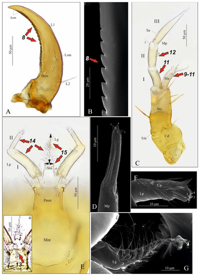 Pseudomedon obsoletus, mature larva. (A,B), right mandible in dorsal aspect, total view (A) and magnification of inner margin (B); (C,D), right maxilla in ventral aspect with apical part of maxillary palp (D); (E,Ea,F,G), labium, ventral aspect (E), dorsal aspect (hypopharynx) (Ea), apical part of labial palp (F) and ligula (G) in lateral aspect. Abbreviations: I–II—segments of Lp, I–III—segments of Mp, 1–2—code of setae, 1–4—sensilla on top of Mp, 1–5—sensilla on top of Lp, Cd—cardo, Cp—cuticular processes, Dsm—dorsal sensillum, L1-2—code of mandibular setae, Lg—ligula, Lp—labial palp, Lsm—lateral sensillum, Ma—mala, Mp—maxillary palp, Sa—sensory appendage, Sm—sensillum, Ss—sclerotized strip, Sts—stipes, Trb—trichobothrium, Mnt—mentum, Pmnt—prementum, arrows 8–15—characters of genus Pseudomedon.