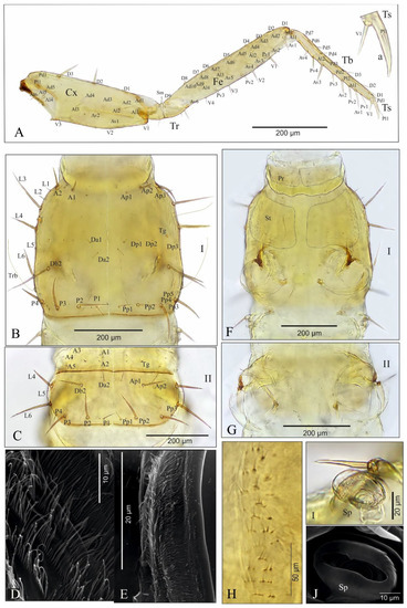 Pseudomedon obsoletus, mature larva. (A–J), thorax; (A), right foreleg in frontal aspect; (B), pronotum; (C), mesonotum; (D,E), microtrichia of anterior (D) region of pronotum and posterior (E) region of mesonotum; (F), ventral side of prothorax; (G), ventral side of mesothorax; (H), microstructure of lateral region of thoracic sternite (I); (I,J), thoracic spiracle. Abbreviations: I, II—segments of thorax, A—anterior seta, Ad—anterodorsal seta, Al—anterolateral seta, Ap—anterior pore, Av—anteroventral seta, Cx—coxa, D—dorsal seta, Db—discal seta, row b, Dp—dorsal pore, Fe—femur, L—lateral seta, P—posterior seta, Pd—posterodorsal seta, Pl—posterolateral seta, Pp—posterior pore, Pr—presternum, Pv—posteroventral seta, Sp—spiracle, St—sternum, Tb—tibia, Tg—tergal gland, Tr—trochanter, Trb—trichobothrium, Ts—tarsus, V—ventral seta.