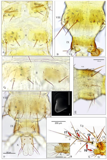 Abdomen. Tergites and sternites of abdominal segments I-VIII divided by longitudinal membranes (Figure 6A–D). Segment I: tergite with transverse carina anterior and five pairs of setae (coded: A1, A3, L5—short, P2 and P4—long), a pair of tergal glands (Tg) and two pairs of pores (Pp1 and Pp2) (Figure 6A); paratergite (Pt) well developed on each side with two setae of different length, parasternites and sternite absent. Segments II-VIII (Figure 6A–E): tergite (Figure 6A,B) with 11–12 pairs of setae (coded: A1, Db2, L3-5, P1-2 and P4; uncoded: 3–4 club-shaped additional) and 1–2 pores (Pp1-2); sternites (St) well developed with 6—St II or 6-7 pairs of setae—St III-VIII (coded: A3, P1 and P4 (Figure 6C,D); uncoded 3-4 club-shaped additional); paratergites (Pt) and parasternites (Ps) elliptical and elongate on each side, with two and four setae (two long, well visible), respectively (Figure 6E). Abdominal segments I–VIII, each with a pair of conical spiracles (Sp) located between tergites and paratergites (Figure 6E,F). Segment IX (Figure 6B,D): without paratergite and parasternite, tergite with four pairs of setae and two pair of pores, sternite with five pairs of setae (two short). Urogomphus (Ug) two-articled: article I very elongate; tapering to apex, about 6.5× as long as wide at the base, with 12 setae—11 simple, pointed (coded: D1-D4, L1-2, L4, Lv1-2 and V2-3) and 1 club-shaped (coded: L3) (Figure 6G); article II very slender and short, about 8.3× as long as wide, about 3.4× narrower than segment I at the base, with one long apical seta and one short subapical seta (Figure 6G); length ratio of articles I, II and apical seta of Ug: 2.5:1:1.6, respectively; Ug 4.3–4.4 as long (without apical seta) as pygopod. Segment X (pygopod) tube-shaped: 1.7× as long as wide at base, with 11–12 pairs of setae (7 macro setae, well visible, 4–5 micro) and 2 pairs of pores (Figure 6D,Ga).