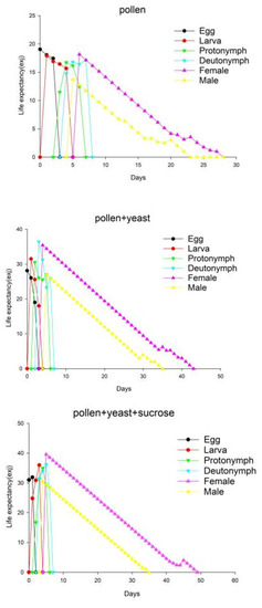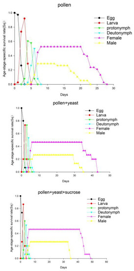 Age differentiation and overlap were found in all three groups (Figure 1). The life span of the males was significantly shorter than that of the females. The Sxj of A. orientalis males and females from egg to adult in the pollen group was 0.29 and 0.53, respectively; the pollen + yeast group was 0.27 and 0.47, respectively, and the pollen + yeast + sucrose group was 0.27 and 0.47, respectively, indicating that there were statistically significant differences between the sexes based on the food provided.