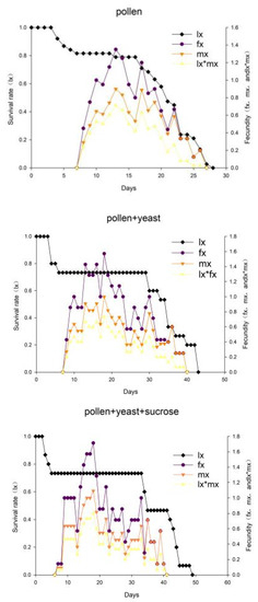 In all three treatment groups, the value of exj decreased (Figure 3). For the pollen group, the pollen + yeast group, and the pollen + yeast + sucrose group, the maximum mean lifetime values were 19.05, 28.13, and 31.88 days, respectively.
