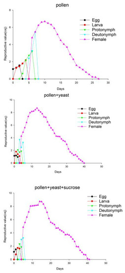 Individuals in the pollen + yeast and pollen + yeast + sucrose groups had significantly higher net reproductive rates (R0) and gross reproduction rates (GRR) than those of the pollen group (Table 2) [20,21]. The intrinsic rate of increase (r) and the finite rate of increase (λ) did not vary significantly between the three groups. The r and λ values of the A. orientalis populations were >0 and >1 for the three groups (Table 2), which indicated that the A. orientalis individuals could survive under different conditions. The individuals in the pollen group had a significantly shorter mean generation time than those in the other two groups [22].