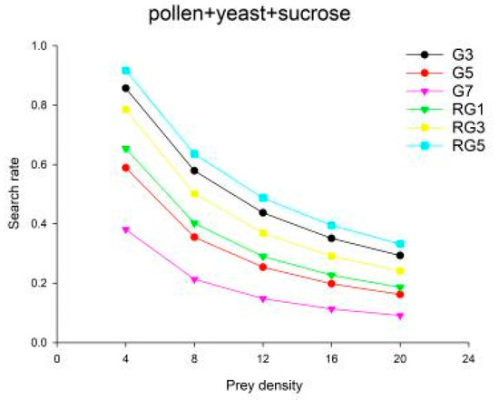 The search effect decreased with an increase in density for the same treatment conditions and generations and followed the pattern of pollen group < pollen + yeast group < pollen + yeast + sucrose group (for the same treatment conditions and generations) (Table 5).
