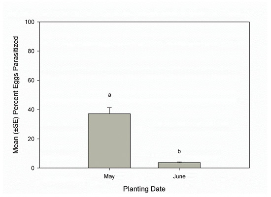 Planting date may influence egg parasitism rates. Field studies have found that A. tristis populations reach higher levels in fields with an earlier planting date than a later planting date [11,12]. In two previous studies, egg parasitism rates were calculated from wild egg masses collected in experimental plots in squash fields at BARC. In the first study, squash fields were planted in mid-May, parasitized eggs were first collected in the second week of July, and the egg parasitism rate increased rapidly, peaking in the last week of July with 72.8% of eggs parasitized [3]. In the second study, squash fields were planted in mid-June, parasitized eggs were also first collected in the second week of July. However, egg parasitism rates increased slowly, reaching an average of only 9.8% at the end of July and an average of 37.7% in the last week of August [4]. The results of these two studies conducted at BARC indicate that there may be significant differences in parasitism rates of H. pennsylvanicus in different years and that planting date could potentially be a factor influencing parasitism rates of squash bugs.