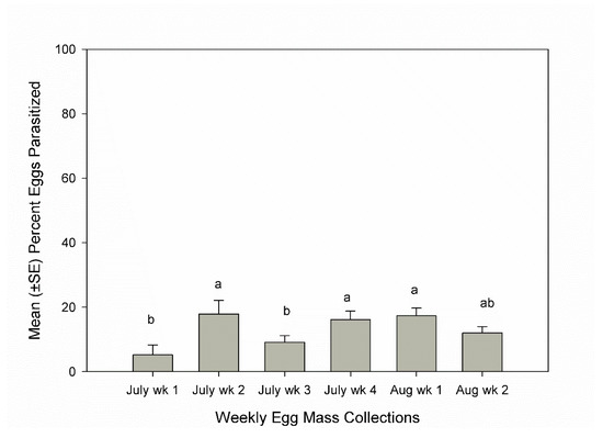 Mean (+SE) percent parasitism on egg masses collected weekly from squash fields, 2016–2021, Beltsville, Maryland, USA. Weeks topped by the same letters were not significantly different (ANOVA: experiment-wise p ≤ 0.05).