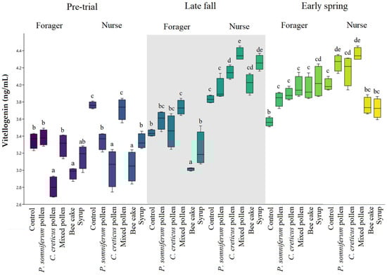 In contrast, a higher Vg level in nurse bees is noticed, especially in early spring, which decreased in late fall. In the third cluster, the forager and nurse bees fed Cistus pollen presented lower values in Vg before feeding pre-trial. Comparatively, in nurse bees, higher Vg levels were detected in early spring and late fall, also noticed in the other feeding groups, particularly in nurse bees fed mixed pollen.