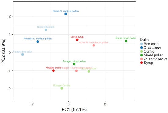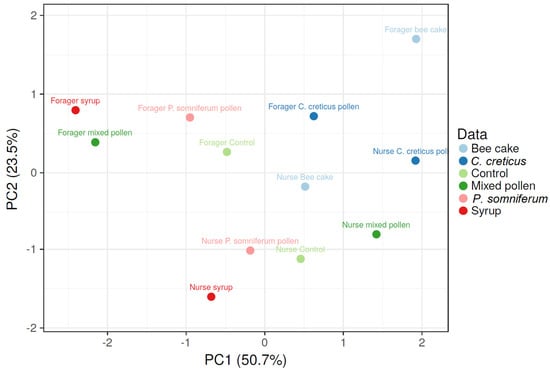 According to the PCA (Figure 2), the first quadrant (upper left) comprises the forager and nurse bees fed with C. creticus pollen that presented lower levels of Vg before feeding, which eventually increased in early spring and maintained its high level until late fall. The second quadrant (upper right) highlights the high content in Vg levels until fall in nurse bees that received the mixture of pollen, followed by the nurse bees fed syrup and P. somniferum pollen with high Vg values in early spring, which significantly decreased in late fall. In the next quadrant (lower right), the forager bees receiving mixed pollen and P. somniferum displayed lower Vg levels in spring and fall, respectively. The last quadrant (lower left) emphasizes the forager control and syrup-fed bees with low Vg levels until late fall.