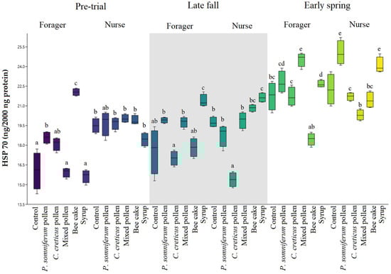According to the PCA (Figure 4), the lowest HSP 70 levels were shown in forager bees before treatment (fed mixed P. somniferum pollen or syrup), which significantly increased in early spring and slightly decreased in late fall (upper left quadrant). In forager bees in the control group, HSP 70 maintained its low levels until the end of the treatment. The following upper right quadrant highlights the bee-cake-fed forager bees with the lowest level in HSP 70, which slightly increased in early spring and maintained its level until late fall. In the following quadrant (lower right), no significant differences in HSP 70 levels were noticed in nurse bees fed mixed pollen. In control, the nurse bees had higher HSP 70 levels before feeding compared with low levels noticed in forager bees. The last lower left quadrant highlights the nurse bees fed with syrup and P. somniferum pollen with the highest HSP 70 levels in early spring, which was maintained until fall in syrup-fed bees, whereas HSP 70 in P. somniferum pollen-fed nurse bees significantly decreased in late fall.