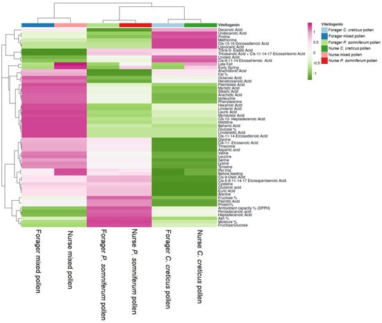 Hierarchical clustering and heatmap visualization of the Vg content present in forager and nurse bees based on the fatty and amino acid profiles of feeding product types. Columns indicate the product types fed to foragers and nurse bees and rows the products’ fatty acid and amino acid patterns along with the content in Vg in different periods. Cells are colored based on the quantity of Vg in each forager and nurse bee, where pink represents a strong positive correlation and green a strongly negative correlation. The row dendrogram resulted from the correlation between the fatty and amino acid profiles and Vg level in different feeding periods; the column dendrogram shows the correlation between foragers and nurse bees and feeding product types.