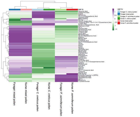 Hierarchical clustering and heatmap visualization of the HSP 70 protein content present in forager and nurse bees based on feeding product types’ fatty and amino acid profiles. Columns indicate the product types fed to foragers and nurse bees and rows the products’ fatty acid and amino acid patterns along with the content in HSP 70 in different periods. Cells are colored based on the quantity of HSP 70 in each forager and nurse bees, where purple represents a strong positive correlation and green a strongly negative correlation. The row dendrogram resulted from the correlation between the fatty and amino acid profiles and HSP 70 level in different feeding periods; the column dendrogram represents the correlation between forager and nurse bees and feeding product types.