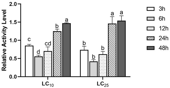 In order to further detect the stress response of GST to (S)-(−)-palasonin in P. xylostella, we detected the change of GST activity in P. xylostella treated with LC10 and LC25 concentrations of (S)-(−)-palasonin for 48 h (Figure 2). The results show that GST enzymatic activity shows a decreasing trend followed by an increasing trend at both concentrations. The GST activity was lower after 3–12 h of treatment in comparison with the control group, and the enzyme activity attained its lowest value after 6 h of treatment, which was 0.56 (LC10 concentration) and 0.42 (LC25 concentration) of the control group, respectively. Nevertheless, the GST activity of LC10 and LC25 treatment groups increased continuously after 24 h. The treatment group increased 1.47-fold and 1.54-fold, respectively, compared with the control group after 48 h.