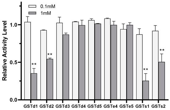 In this study, these nine recombinant GSTs (GSTd1, GSTd2, GSTd3, GSTd4, GSTd4, GSTd5, GSTe4, GSTe5, GSTs1 and GSTs2) proteins were accessed by a prokaryotic expression system and the recombinant proteins were expected to have a molecular weight of 25 k Da (Figure S1). The yield of nine purified proteins was 0.6 μg/μL, 1.8 μg/μL, 0.33 µg/µL, 0.95 µg/µL, 0.7 µg/µL, 1.22 µg/µL, 0.62 µg/µL, 1.43 μg/μL and 0.48 μg/μL, respectively.
