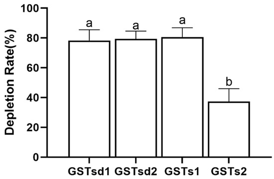 The expression and purification of GSTs protein were performed by the previously published methods [22]. The GSTs genes were incorporated into the pET-30a (+) vector (TaKaRa, Dalian, China). We transformed E. coli BL21 (DE3) cells (Weidi, Shanghai, China) with the recombinant plasmid and incubated them in an LB medium containing kanamycin (100 μg/mL) until the log phase (OD600 = 0.6). Isopropyl-β-D-thiogalactoside (IPTG, 0.1 mM) was then added to the bacterial broth and incubated at 200 rpm, 30 °C for 6 h. The bacteria were pelleted by centrifugation (8000× g, 4 °C), then resuspended in PBS (10 mM, pH 7.4). After sonication, the lysate was centrifuged and the target proteins purified from the supernatant by Ni2+-NTA affinity column (Smart-Lifesciences, Changzhou, China), verified by SDS-PAGE and dialyzed overnight. The protein concentration was determined by BCA, and the obtained GSTs proteins were preserved at −80 °C for subsequent experiments.