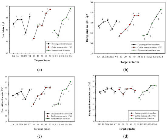 Effect of the decomposition inoculant, cattle manure ratio, and fermentation duration on the feed intake (a), dung-sand weight (b), feed utilization rate (c), and dung-sand conversion rate (d) of the 3rd instar larvae of P. brevitarsis. Tukey’s multiple-range tests were used for the analysis. The same factor with a different letter indicated a significant difference (p < 0.05, n = 20).