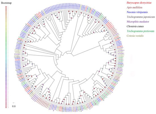 Phylogenetic tree of 233 odorant-binding proteins (OBPs) from B. dioryctriae and seven other Hymenoptera species. The protein sequences used in this phylogenetic analysis are listed in File S1. The size and color of the dots reflect their bootstrap values. The color scale is shown on the left, with larger dots indicating larger bootstrap values.