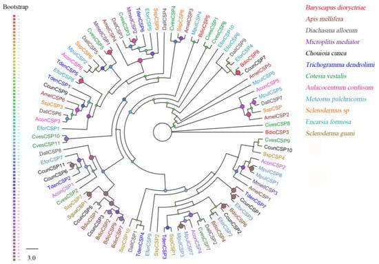 Phylogenetic tree of 90 chemosensory proteins (CSPs) from B. dioryctriae and 11 other Hymenoptera species. The protein sequences used in this phylogenetic analysis are listed in File S2. The size and color of the dots reflect their bootstrap values. The color scale is shown on the left, with larger dots indicating larger bootstrap values.