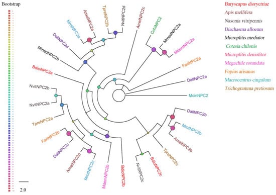 Phylogenetic tree of 29 Niemann–Pick type C2 proteins (NPC2s) from B. dioryctriae and other 10 Hymenoptera species. The protein sequences used in this phylogenetic analysis are listed in File S3. The size and color of the dots reflect their bootstrap values. The color scale is shown on the left, with larger dots indicating larger bootstrap values.