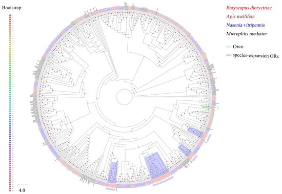 Phylogenetic tree of 705 odorant receptors (ORs) from B. dioryctriae and three other Hymenoptera species. The protein sequences used in this phylogenetic analysis are listed in the Supplementary Materials (File S4). The size and color of the dots reflect their bootstrap values. The color scale is shown on the left, with larger dots indicating larger bootstrap values.