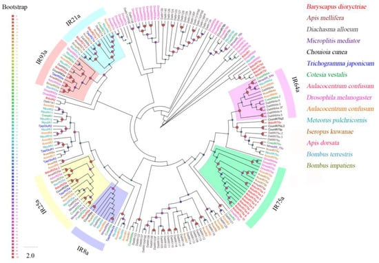 Phylogenetic tree of 211 ionotropic receptors (IRs) from B. dioryctriae and 13 other Hymenoptera species. The protein sequences used in this phylogenetic analysis are listed in the Supplementary Materials (File S5). The size and color of the dots reflect their bootstrap values. The color scale is shown on the left, with larger dots indicating larger bootstrap values.