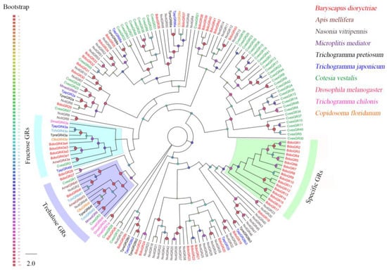 Phylogenetic tree of 120 gustatory receptors (GRs) from B. dioryctriae and nine other insect species. The protein sequences used in this phylogenetic analysis are listed in the Supplementary Materials (File S6). The size and color of the dots reflect their bootstrap values. The color scale is shown on the left, with larger dots indicating larger bootstrap values.
