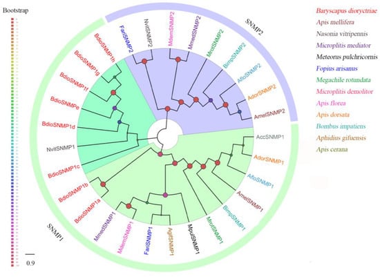 Phylogenetic tree of 29 sensory neuron membrane proteins (SNMPs) from B. dioryctriae and 12 other Hymenoptera species. The protein sequences used in this phylogenetic analysis are listed in the Supplementary Materials (File S7). The size and color of the dots reflect their bootstrap values. The color scale is shown on the left, with larger dots indicating larger bootstrap values.