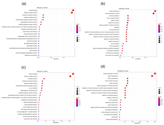 GO enrichment of 393 up-regulated unigenes in FA. (a) Unigenes enriched into the molecular function category. (b) Unigenes enriched into the biological process category; GO enrichment of 365 up-regulated unigenes in MA. (c) Unigenes enriched into the molecular function category. (d) Unigenes enriched into the biological process category. (The size and color of the red and blue dots represent the count and p-value of the category, respectively, and their rulers are shown on the right side of each subgraph).