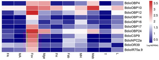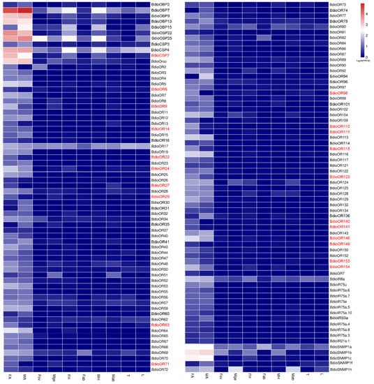 Expression profiles of antennae-biased chemosensory genes in B. dioryctriae. The chemosensory genes with female antennae-biased expression are marked in red, with a standard of q value < 0.005 &|log2 (fold change) > 2 when FA vs. MA. FA and MA: female and male antennae; FH and MH: female and male heads without antennae; Fab: female abdomens without ovipositors and digestive tracts; Fov: female ovipositors; Mge: male genitalia; Mab: male abdomens without genitalia and digestive tracts; T: male and female thoraxes; L: male and female legs.