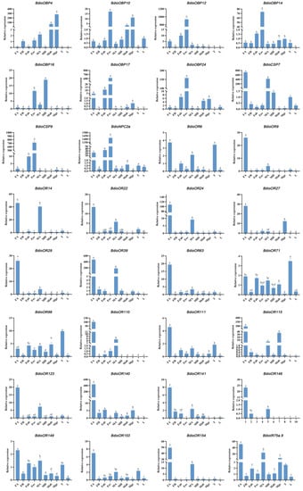 The RT-qPCR assay was conducted for analyzing and validating the expression patterns of the 32 candidate chemosensory genes with female antennae- and ovipositor biased expression that were calculated with top FPKM values (Figure 11). As expected, there were 26 chemosensory genes (26/32, more than 80%) showing the same expression pattern to the analysis results that were analyzed by the FPKM (Figure 9 and Figure 10). For the other six chemosensory genes, BdioOR6 showed high expression in thoraxes as well as female antennae; BdioOR71 and BdioOR98 also showed higher expression in thoraxes than in other tissues; BdioOBP4 showed much higher expression in male genitalia rather than in ovipositors; BdioOR39 and BdioIR75a.9 showed high expression in female antennae rather than in ovipositors; thus, these two (BdioOR39 and BdioIR75a.9) were redistributed into the female antennae-biased expression group. Therefore, after the validations by RT-qPCR, a total of 28 chemosensory genes with female antennae- (20 genes) and ovipositor-biased expression (8 genes) were speculated as the targets that might be involved in detecting the key cues during host recognition, location, and oviposition in B. dioryctriae (Table 4).
