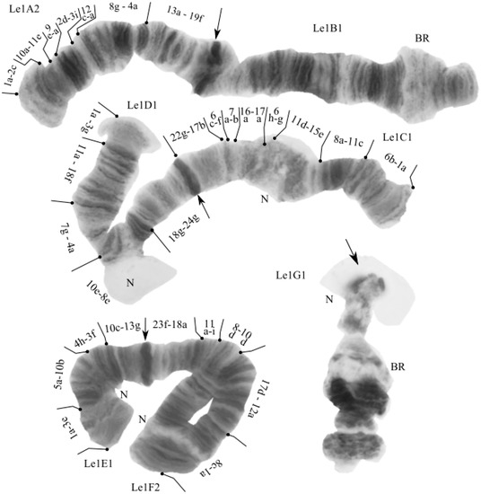 Part of the Chironomus sp. Le1 karyotype from a hybrid of Ch. sp. Le1 × Ch. laetus from the Yamal Peninsula, Russia. Arrows indicate a centromeric bands; Le1A2, Le1B1, etc., genotypic combinations of banding sequences in chromosome arms; BR—Balbiani rings; N—nucleous.